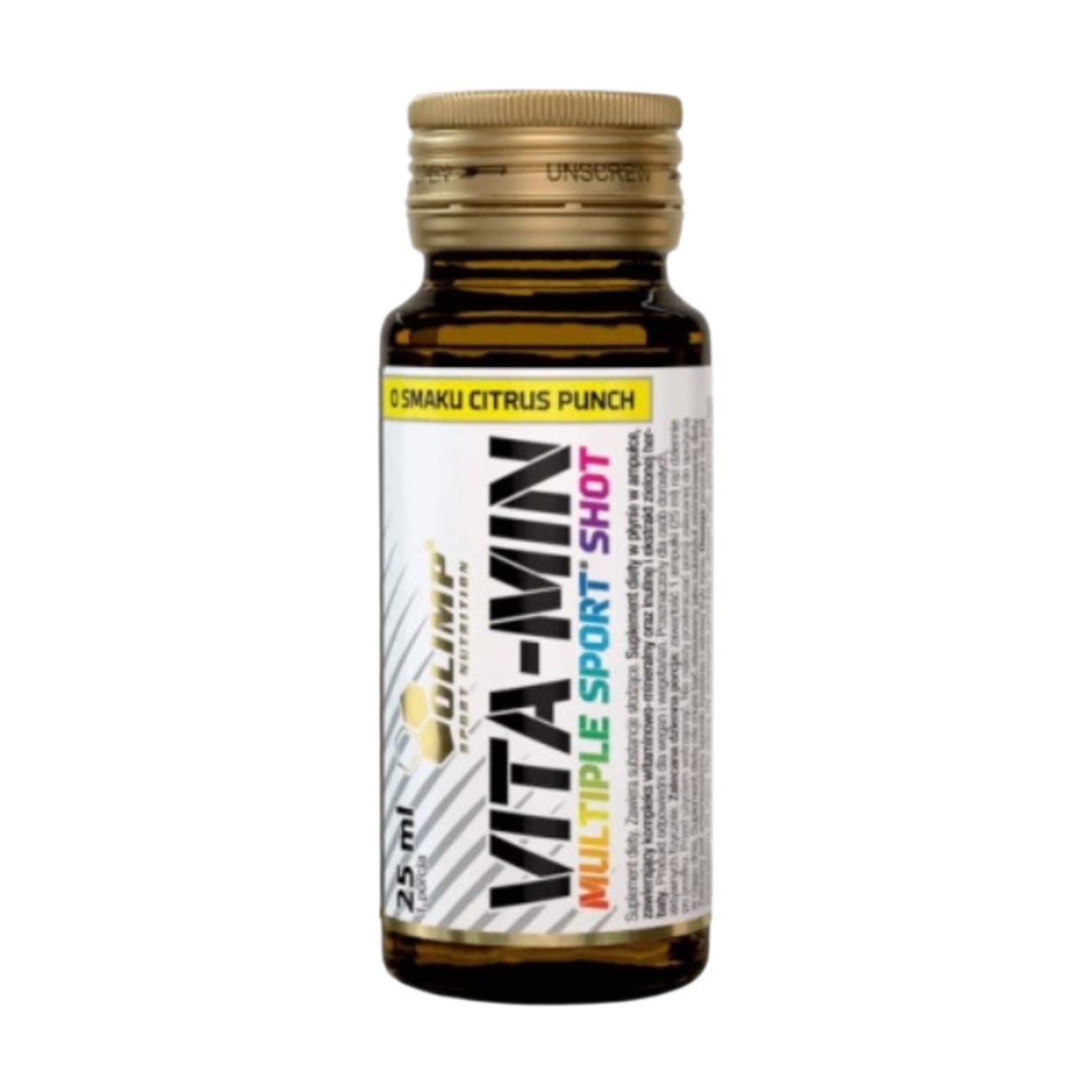 Το OLIMP Vita-Min Multiple Sport Shot είναι ένα συμπλήρωμα διατροφής σε βολική μορφή αμπούλας, που περιέχει βιταμίνες και μέταλλα απαραίτητα στη διατροφή κάθε αθλητή. Το προϊόν περιέχει συστατικά όπως η βιταμίνη Β1 και Β2, υπεύθυνα για τη διατήρηση του σωστού ενεργειακού μεταβολισμού, και μέταλλα με τη μορφή χηλικών αμινοξέων Albion™ (μαγνήσιο, ψευδάργυρος, χαλκός και μαγγάνιο) σε μια καινοτόμο, ήπια για το στομάχι και υποαλλεργική μορφή. Η αμπούλα έχει επίσης εμπλουτιστεί με την προσθήκη ινουλίνης και εκχυλίσματος πράσινου τσαγιού, που ανακουφίζει από το πρήξιμο και βελτιώνει την κυκλοφορία του αίματος.