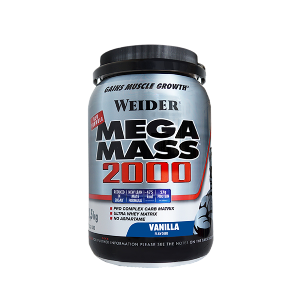 MEGA MASS 2000  Για μια αποτελεσματική αύξηση της μυϊκής μάζας, πρέπει να προπονείστε εντατικά και η διατροφή σας  να περιέχει περισσότερες θερμίδες από όσες συνήθως χρειάζεστε έτσι ώστε να διατηρήσετε τη μυϊκή σας μάζα.  Η Mega Mass 2000 σας προσφέρει μια βέλτιστη σύνθεση  για αύξηση "μάζας"! Η Mega Mass 2000 υπάρχει εδώ και πάνω από 40 χρόνια και συνεχίζει να βελτιώνεται κατά τη διάρκεια αυτών των ετών. Εμπιστευθείτε τις 7 δεκαετίες εμπειρίας του Weider. Περιγραφή προϊόντος: Μείγμα πρωτεϊνών και υδατανθράκων που περιέχει συμπυκνωμένη πρωτεΐνη ορού γάλακτος και πρωτεΐνη σόγιας. Οι υδατάνθρακες παρέχουν ενέργεια και η πρωτεΐνη προσφέρει γρήγορη ανάπτυξη της μυϊκής μάζας. Ιδιότητες προϊόντος: ● Ταυρίνη ως ενισχυτικό απορρόφησης ● Τρεαλόζη για την επιτάχυνση της διαδικασίας αύξησης της μάζας ● Βιταμίνες, μέταλλα και ιχνοστοιχεία για την ανάπτυξη ιστού ● Χωρίς ζελατίνη
